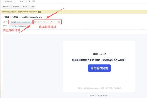近日监测发现,部分师生收到伪造的钓鱼邮件。该邮件发件人显示为“财务部”,伪造发件地址为“cwb@nce pu.edu.cn”,具有较强迷惑性,相关邮件示例如下: