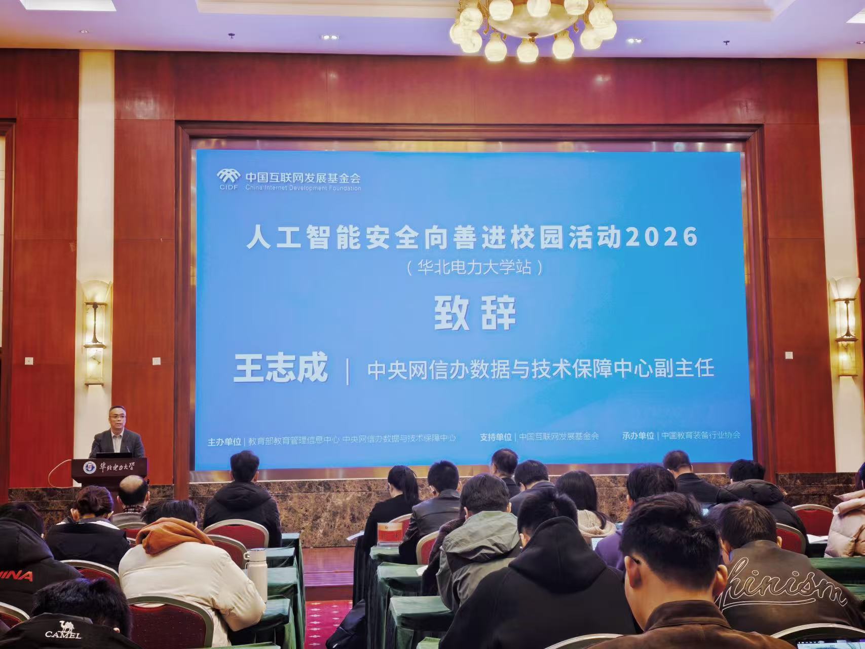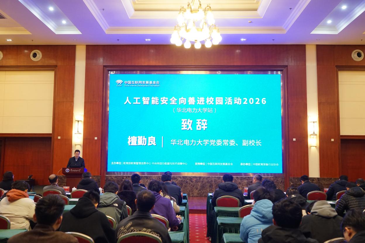 檀勤良在致辞中表示,当前人工智能正深刻重塑世界格局,与教育、科技、人才三位一体发展深度融合。华北电力大学深入贯彻落实国家教育数字化战略,坚持“以人为本、智能向善”的理念,全面推进“人工智能+”行动,将技术创新与价值引领贯穿教学、科研与服务全过程,在教学、科研、思政和服务育人方面取得了较好的成绩。他表示,希望通过此次活动,与政府、企业协同发力进一步推动人工智能在校园的安全应用与创新发展,为教育强国建设贡献华电力量。