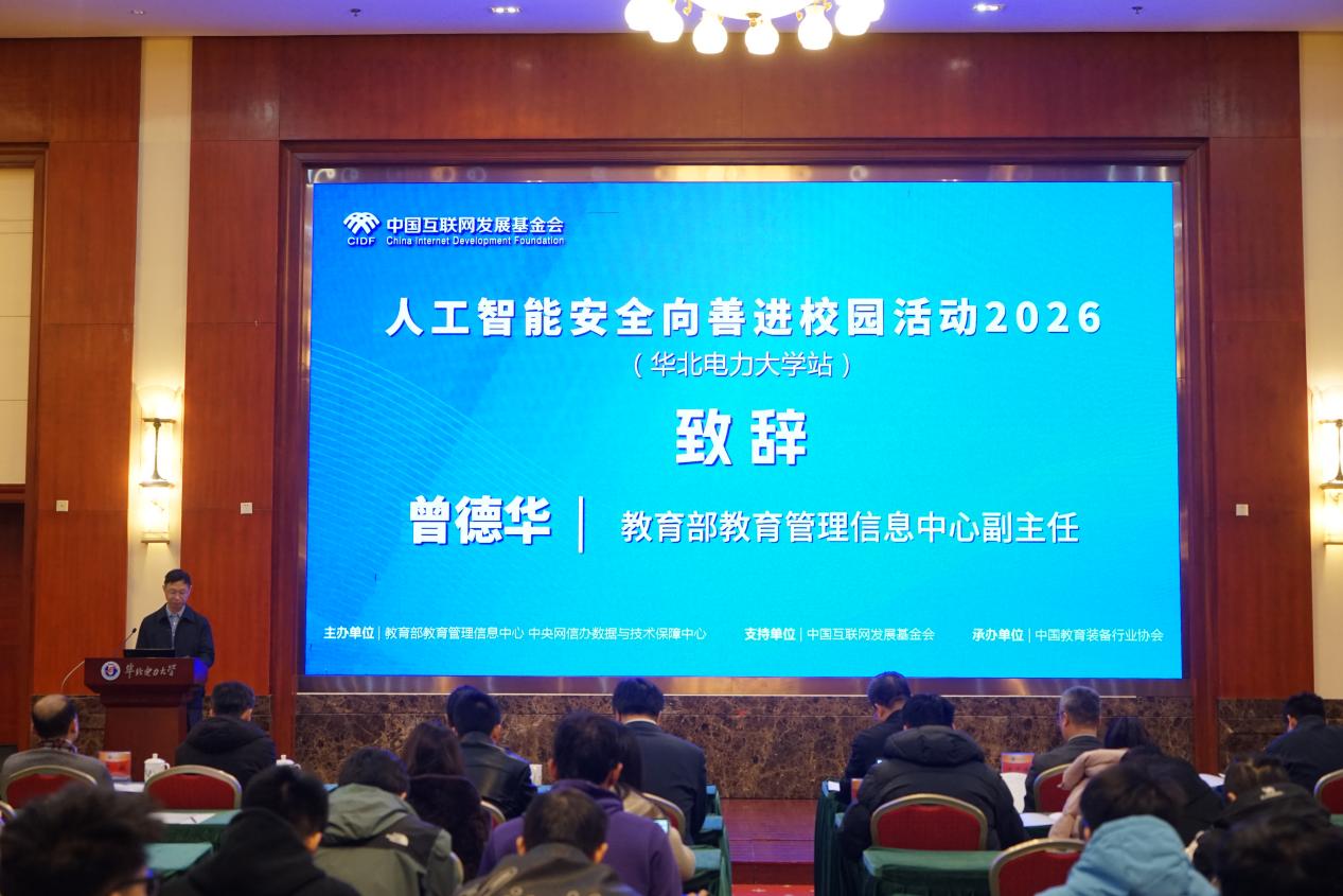 曾德华在致辞中表示,感谢华北电力大学为此次活动的举办提供大力支持。他强调,人工智能正深刻重塑教育形态,为高校创新发展带来新的机遇。人工智能在赋能校园管理智能化、师生服务精准化的同时,也伴随着数据隐私、算法公平等技术伦理的挑战。各高校必须深刻认识人工智能对教育的双重影响,以及坚持人工智能安全向善的重要性,要以“技术向善”为引领,在推动AI赋能教育的同时,牢牢把握安全发展边界,让人工智能真正服务于立德树人根本任务。